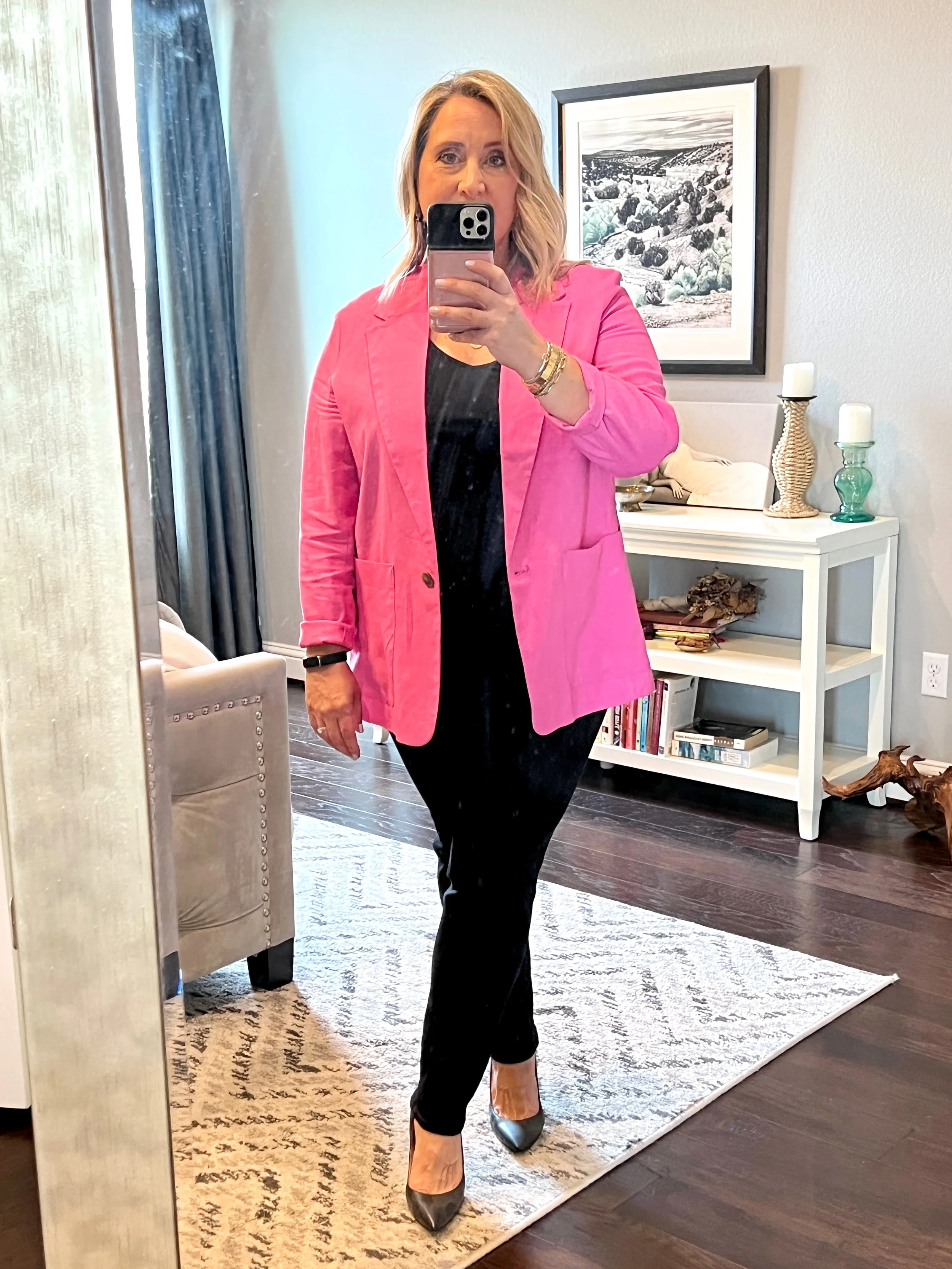 The pink is an on-trend, bold hue for spring, and it’s a way to infuse some color into your looks.